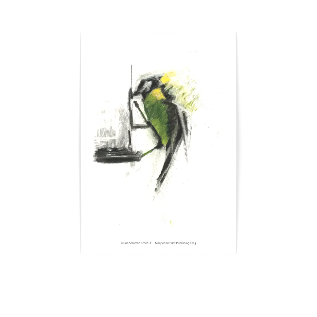 An expressive rendering of the Great Tit, with lush yellow and green plumage. Compliments Erin's other images in the series- Bird On Washing Line and Blue Tit.