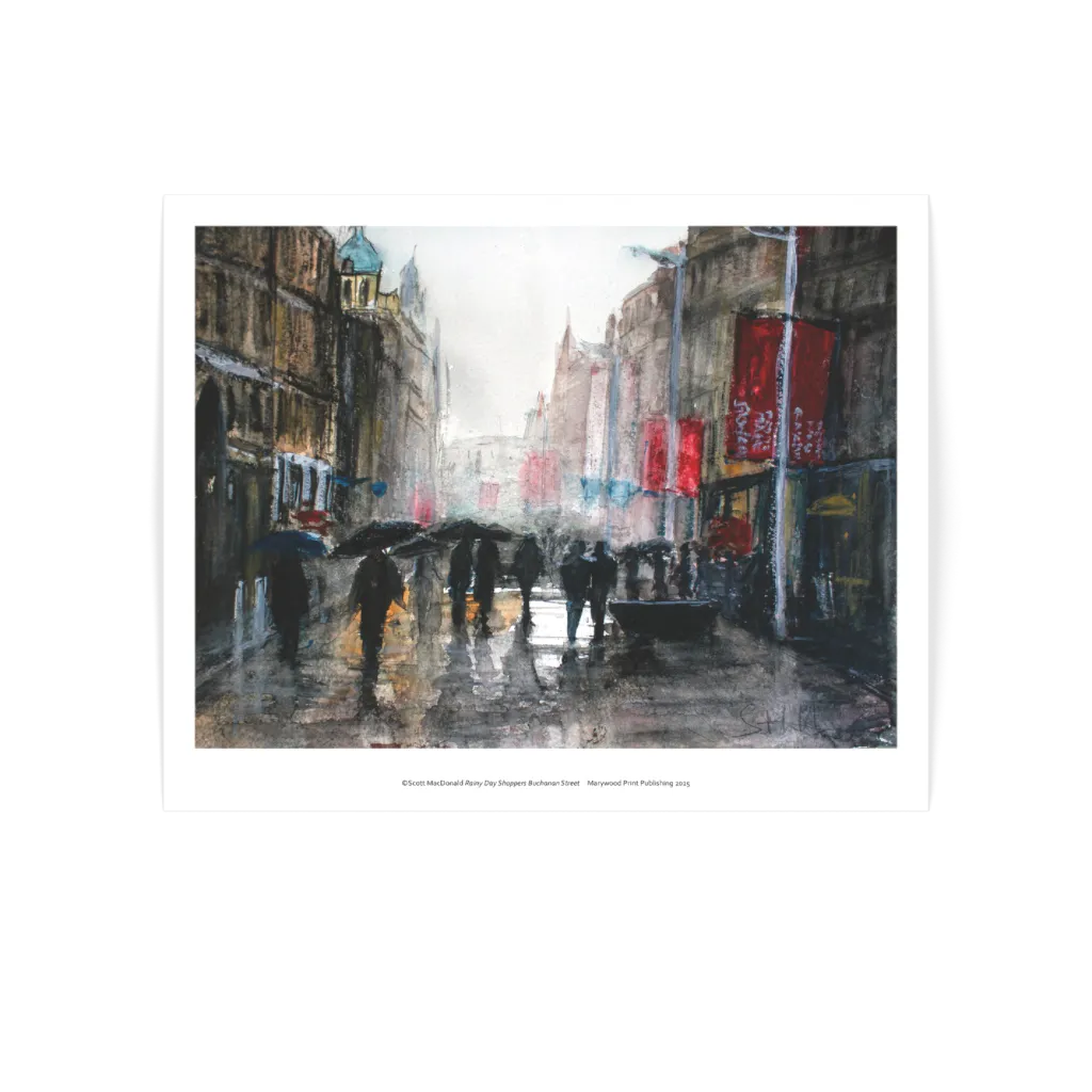 Capturing the jostling crowds on Glasgow's most iconic thoroughfare with this evocative urban scene, Scott depicts the characteristic hustle and bustle of Buchanan Street on a rainy day. Shoppers navigate the wet pavements beneath grey Scottish skies in a composition that masterfully conveys the movement and atmosphere of one the famous Buchanan Street. Perfect for those with a connection to Glasgow or an appreciation for contemporary urban art.